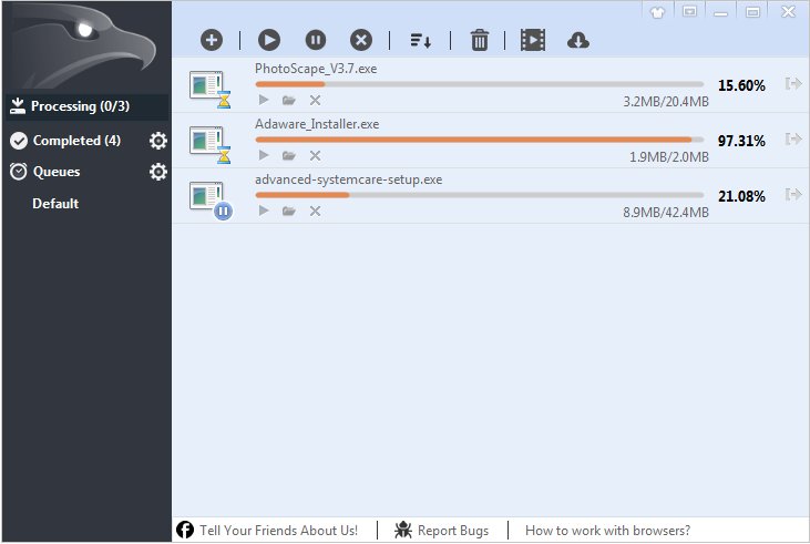 • دعم جميع المتصفحات الشعبية. EagleGet يدعم جميع المتصفحات الشعبية بما في ذلك كروم، فايرفوكس وإنترنت إكسبلورر. بغض النظر عن المتصفح الذي تستخدمه، يمكنك ان تتمتع دائما أقصى سرعة التحميل بدون حدود.